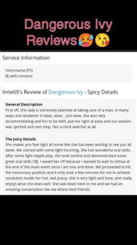 HELLO GENTLEMEN 💜 I'M DANGEROUS IVY I specialize in fetishes (BBJ, SQUIRTING,NURU MASSAGE, FACIALS)and the SENSUAL massages with a full menu to offer. Massage included in HHR+ I'm always in heels and lingerie ❤. I do not serve gentlemen under 30! My hygeine is A+ and yours should be as well. If not, please request cleaning supplies, I have them for you. ! FREAKY 🎥 SUBSCRIBE HERE! 👉🏿 ONLYFANS.COM/DANGIVY *FOLLOW ME HERE⬇* VERIFIED AND REVIEWED EM ID:400690 Twitter: @dangivy2 PREMIUM SNAP ONLY: Dangivy2 *OUTCALLS REQUIRES A $40DEPOSIT* NO CASHAPP