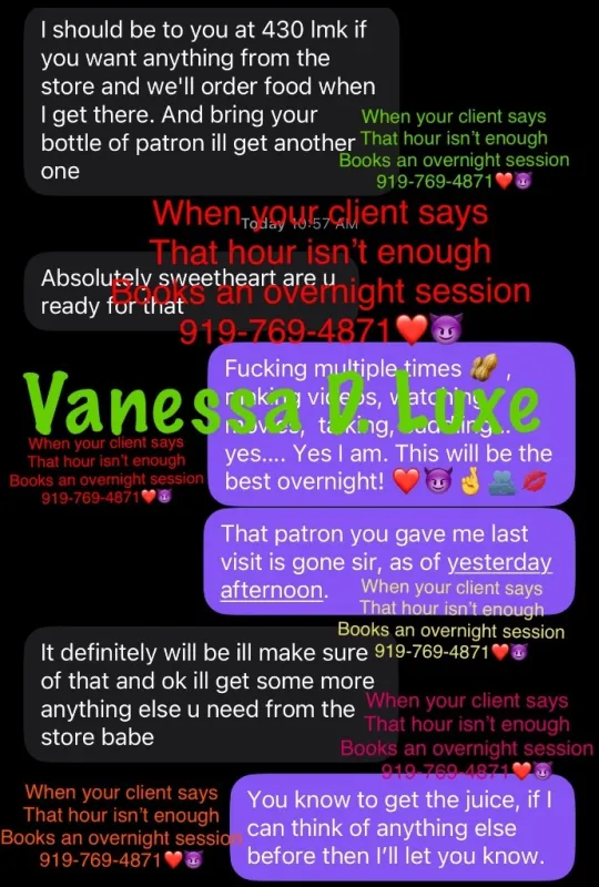 I am selective with who I meet—this experience is not for everyone $50 Deposit & Screening is required for my safety. If thats a problem there are many options on this site. Just because you're deposit ready, doesn't guarantee that we are going to hookup, it's at my discretion. I don't respond to text messages from new friends. "Yesterday's price is not today's price." Rates • 180 quick visit • 220 half session + relaxation massage • 300 extended half session • 440 full hour someone is impersonating me, if you fall for it, that is on you! I have one phone number! I screen my new friends & require a deposit. New IG account : vanessadluxe (I won't add everyone especially fake profiles)