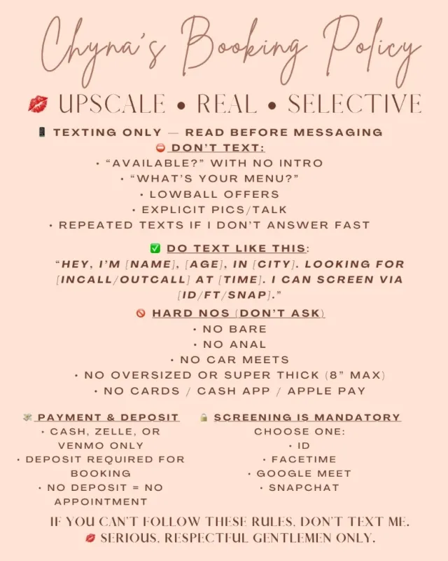 📌 Texting template is in my pics — please follow it so I know you’re respectful and actually read my ad. • No oversized 🍆 (over 8” & super thick) – please respect this. • Absolutely NO bare – don’t ask, extra won’t change my rules. • Boundaries: No anal, no GFE, no car dates. • Be freshly showered & clean 🧼. • Only contact me if you’re ready now. If you are not ready now and want to make an appointment, a deposit is required. • I cater to upscale, generous gentlemen 30+. If you’re under 30 I NEED A DEPOSIT • Preferably outcall, but incall is available. (If you’re 1+ hour away, deposit required). • No lowballing – I am not for everyone. Please respect my rates. • Discreet location available for incall. • Overnights available ✨. Hourly highly recommended • I am 100% independent – no agency. • Payment: Cash, Venmo, Zelle only. (No CashApp or Apple Pay). • No unsolicited explicit pics – will result in a block. • Yes, I am real. My body matches my photos & I look even better in person 💕. • Screening is mandatory (FaceTime, Google Meet, Snapchat, or ID verification). 📱 Text or call when you’re ready 🥰 Socials: Instagram- chynawhytexx snap-chynawhytexx